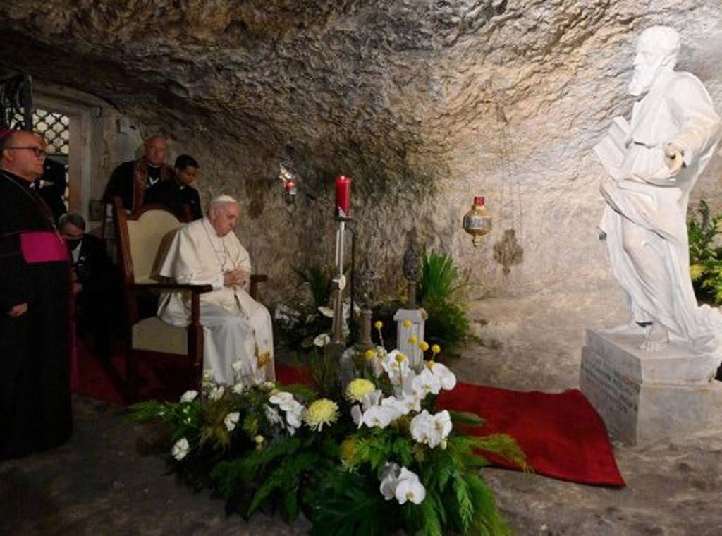 U ovoj je špilji prema predaji Sv. Pavao proveo tri mjeseca naviještajući evanđelje i oko nje je nastala prva kršćanska zajednica na Malti. Papa Franjo se spustio u špilju gdje se pomolio i zapalio svijeću pred kipom zaštitnika Malte. Molio je za “milost dobroga srca” i ponovno pozvao na iskazivanje dobrodošlice izbjeglicama i ljudsko bratstvo te osudio ravnodušnost. Upisujući se zatim u knjigu posjeta primio je na dar reljef Sv. Pavla.
