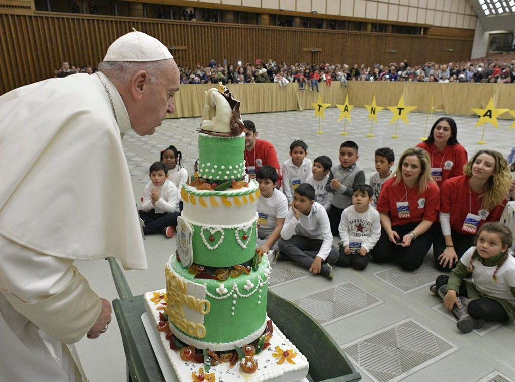 Tijekom tradicionalnog predbožićnog susreta s djecom i osobljem mladi pacijenti pjesmom i plesom spomenuli su se predstojeće svetkovine Božića te čestitali Papi rođendan. Donijeli su i veliku tortu koja će se jesti na ručku organiziranom nakon Angelusa.