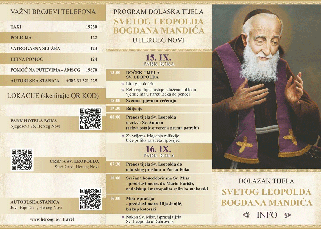 Turistička organizacija Herceg Novog priredila je depliant s informacijama o parkiralištima i drugim potrebnim uputama, kao i korisnim telefonskim brojevima za hodočasnike koji će u Herceg Novi doći u organiziranim grupama ili u osobnom aranžmanu.