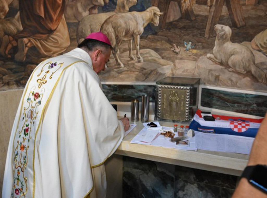 Svečanu misu u Svetištu Slava na visini Bogu predvodio je splitsko-makarski nadbiskup u miru mons. Marin Barišić, u zajedništvu s brojnim fratrima, javlja IKA. Mons. Barišić je u svojem razmišljanju naglasio: "Velik je ovo dan za hrvatske hodočasnike, našu Crkvu, naš narod i hrvatsku državu. Kad god se ovdje slavi misa, onda je to božićno ozračje. Danas, kada slavimo na simboličan i stvaran način misu od Božića, rođenja Gospodinova, blagoslivljamo početak radova nove crkve, novog doma Božjega, ovdje na Polju pastira u Betlehemu. To će biti jedan kutak Hrvatske u Svetoj zemlji."